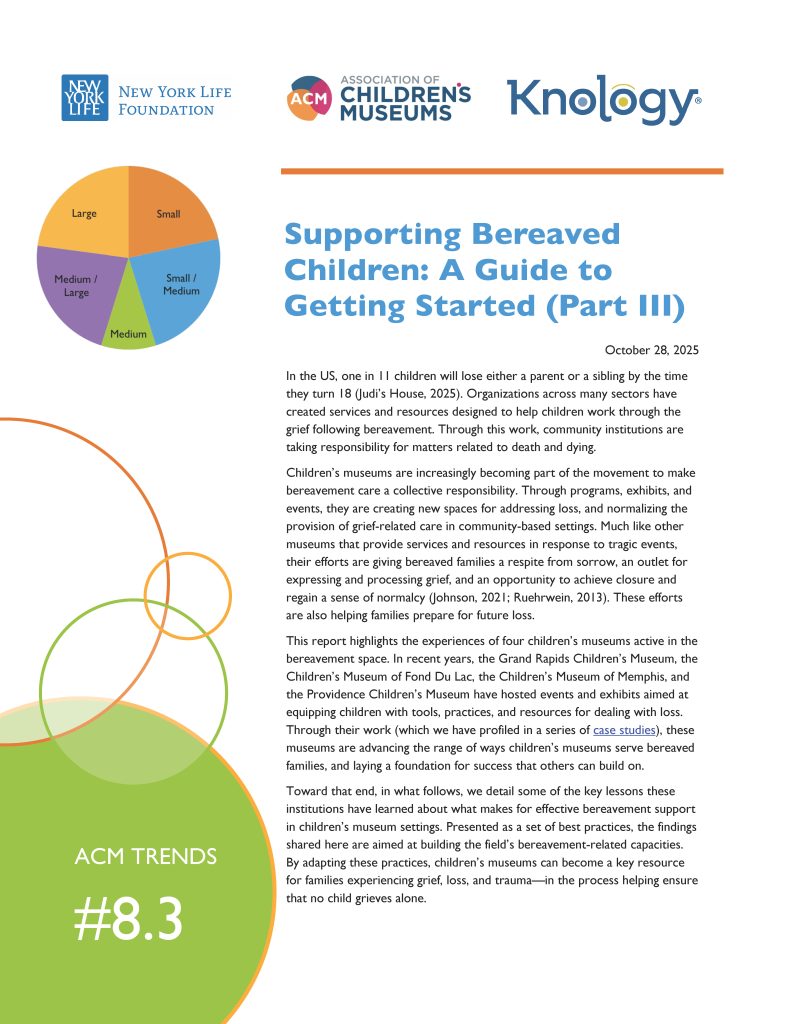 This report highlights the experiences of four children’s museums active in the bereavement space. Through their work (which we have profiled in a series of case studies), these museums are advancing the range of ways children’s museums serve bereaved families, and laying a foundation for success that others can build on.